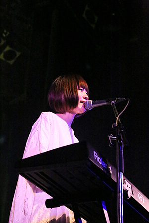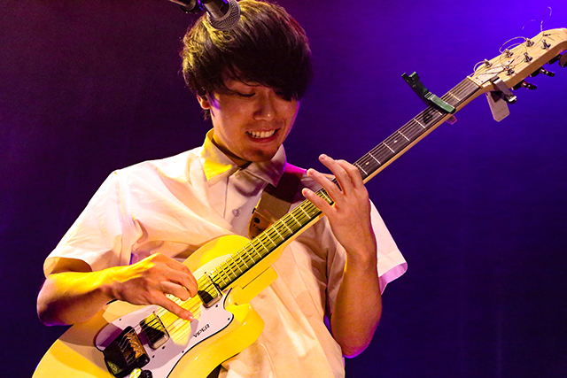 「つづくいのち」「太陽と暮らしてきた」では、だいじろー(Gt/Cho)の高速タッピングに目を奪われる。クリーンなギターの音色が洪水のように流れ、音の海に飲み込まれていくようだ。そんな超絶テクニックを繰り出す本人は、全編を通して無邪気な笑みを浮かべているのだから、参ってしまう。まるでおもちゃを与えられた子どものように、「楽しくて仕方がない!」といった様子だ。hatch(Dr)の奏でるリズムは抜群に安定感があり、変態的と言っても過言ではないほど変則的なのに、なぜかリラックスして聴ける。その証拠に、フロアの後ろでは両手を上げて伸びをする観客もいたほどだ。