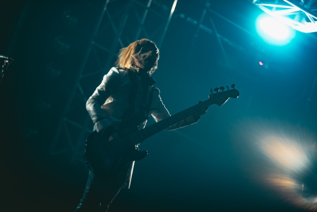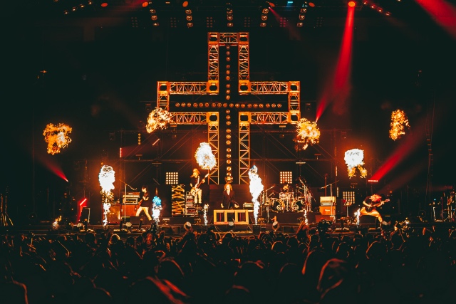 中盤のセクションは、「予言」、「-ZANGE-」、そして「-SHAMBARA-」といった、宗教色のある楽曲が配置され、セットの十字架が効果的に使用された演出、レーザービームや照明も雰囲気にあった効果を生み、大会場ならではの興奮を巻き起こす。そして、楓のカッティングが空間を切り裂き始まったパンクチューン「人生謳歌」は、先程までの重厚な雰囲気を振り払うかのように、力強さに満ちていた。