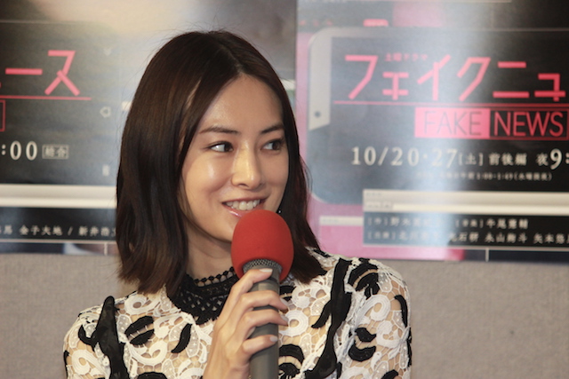 10月20日と27日に前後編で放送されるNHK土曜ドラマ『フェイクニュース』の試写会が10月11日に東京・渋谷の同局で行われ、試写会後の会見に主演の北川景子、脚本の野木亜紀子らが登壇した。