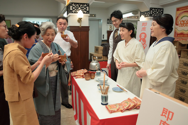 大急百貨店でのこと。試食を提供し始めたところ、1人、また1人と「まんぷくラーメン」の売り場に人々が駆けつけてきた。お湯をかけて、出来上がるまでの流れを実演してみせたわけだが、ここから福子の怒涛の3分間トークが始まる。闇市でのエピソード、食べることの重要性を実感したこと、献立を毎日考えるのは大変だということ、そこからさらに開発の苦労を話し、グルテンのアルファ化やら多孔質化に触れつつ、最後に価格の妥当性を強調して、なんとかその場を繋いだのだ。