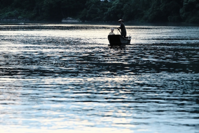 橋の建設工事が進む山間部の川。トイチという名の船頭(柄本明)が長年一人で渡し舟を漕ぎ、村人や街からの来客を運んできた。「橋が完成すれば、便利になるよ」。乗客たちはトイチの心情を気にもかけず、そんなことを放言する。この映画は驚くべきことに、舟の上と、両岸の狭い範囲だけでロケされている。2時間17分という決して短くない上映時間のあいだ、私たち観客はただただ渡し舟の緩慢なすべりに身をゆだねていればいい。陸(おか)という陸はひたすら不吉な空間にすぎないのだから。時代ははっきり説明されないものの、明治後期あたり。トイチが舟を漕ぎながら見聞きする乗客たちのよもやま話、噂話、憎まれ口は、客が向こう岸に着けば泡のように消えてしまい、代わって虫や鳥の鳴く声、水の流れる音、風の吹く音、草木の揺れる音があたりを支配する。ロケーション条件はミニマリズムだ。