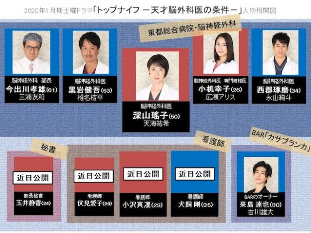 天海祐希が主演を務める2020年1月クールの日本テレビ系土曜ドラマ『トップナイフ-天才脳外科医の条件-』に、椎名桔平、広瀬アリス、永山絢斗、古川雄大、三浦友和が出演することが決定した。