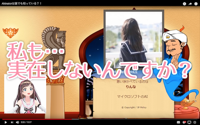 キズナアイは「りんな(マイクロソフトの開発したAI)」を思い浮かべてアキネイターの質問に答えていく。「質問その1」で「実在しますか?」との質問に迷わず「はい」を押したキズナアイは答えにたどり着けず、「質問その40」「42」で同じ質問にループしてしまう。「実在しますか?」の問いに「いいえ」を押したキズナアイは、やっと正解であるりんなにたどり着き、しかしこう語るのだ。