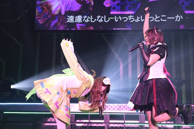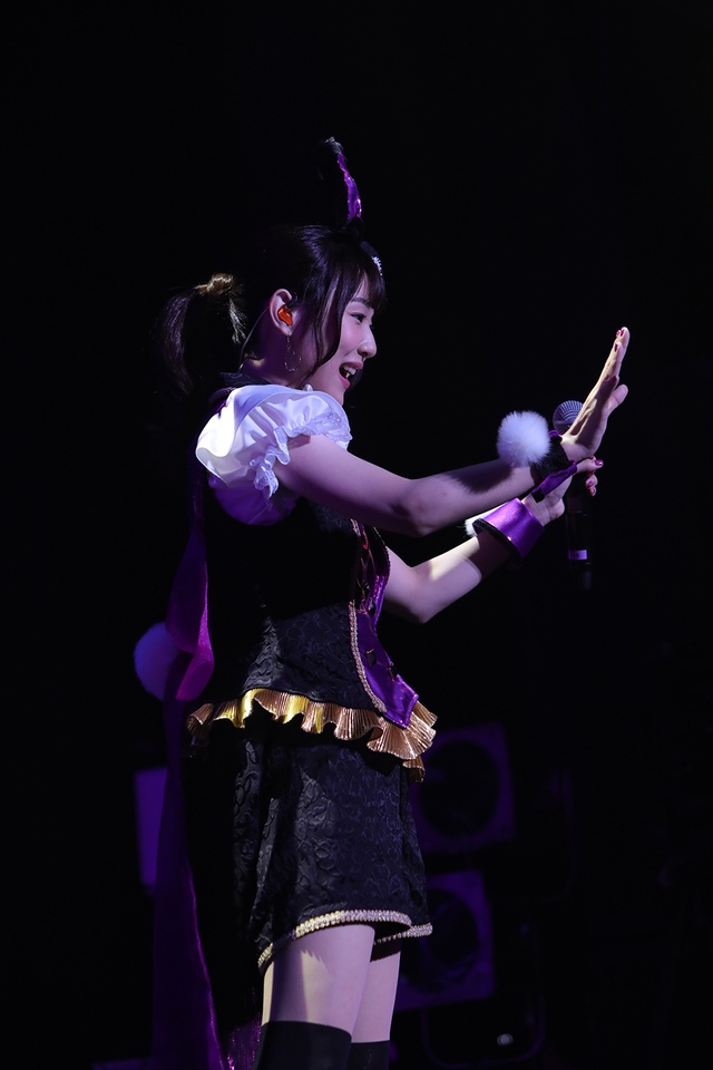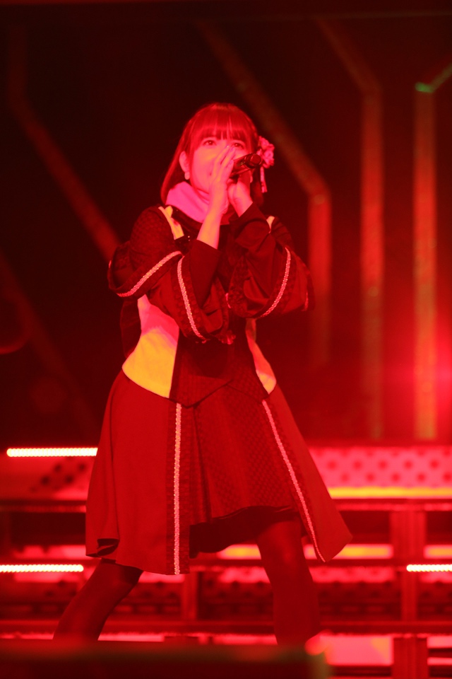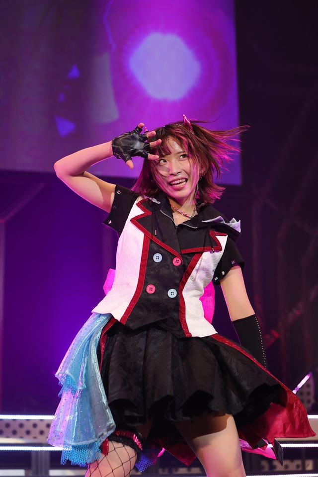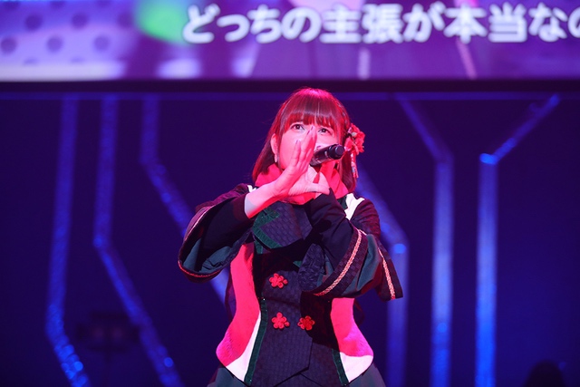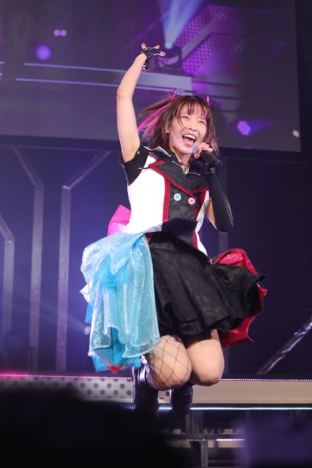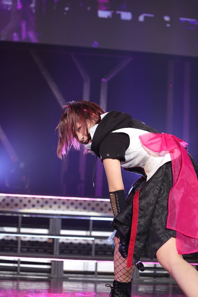 続いての⊿TRiEDGEパートは、朝日奈のソロからスタート。「P!P!P!P!がおー!!」では、ステージアンプに片足を乗せるなど、身振り手振りまで莉玖が乗り移ったパフォーマンスを見せる。曲の途中、本来久保ユリカと橋本ちなみが登場する箇所では、欠席の久保にかわり、久保田と春野が登場し、サプライズで会場を盛り上げた。橋本のソロパートでは、椿のソロ曲である和テイストのボカロック「タテマエと本心の大乱闘」を披露。インタビューでも話していた通り、椿らしいクールな表情を保ちつつ、最後に笑顔をのぞかせる振り付けも特徴的だった。