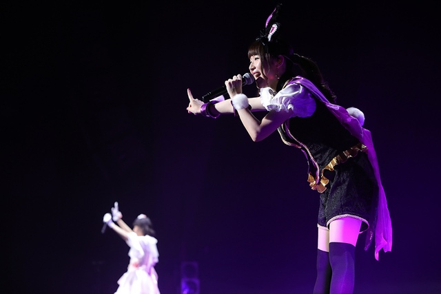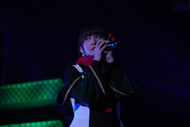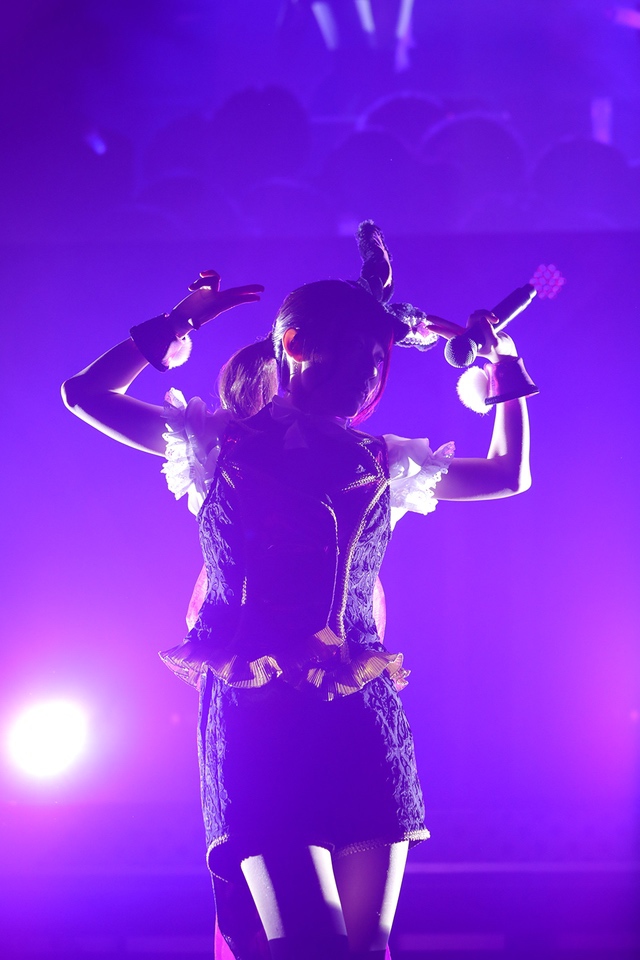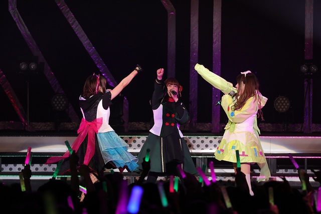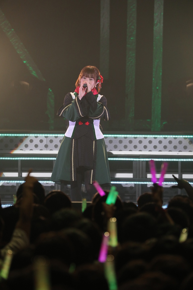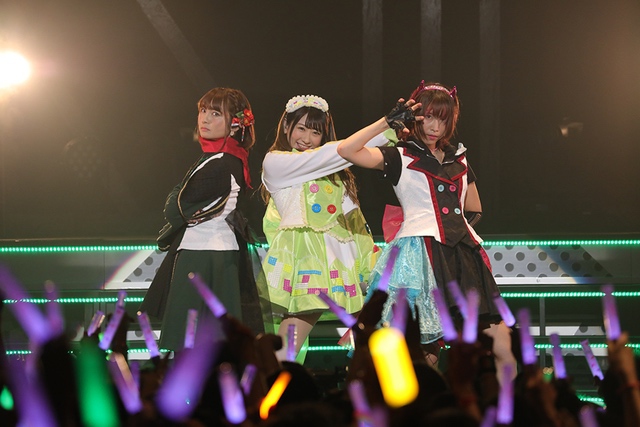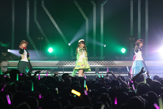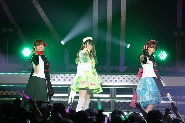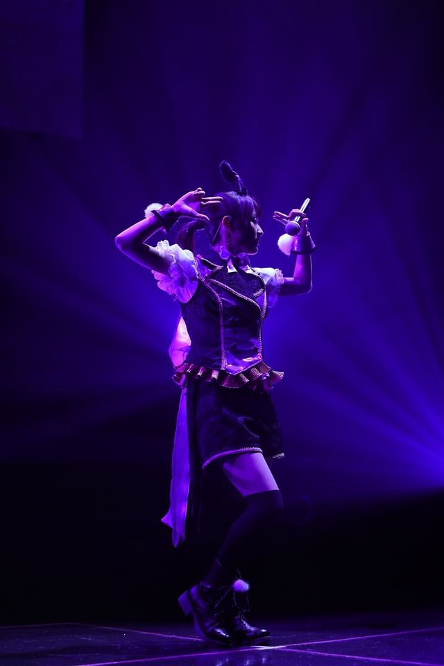 続いての⊿TRiEDGEパートは、朝日奈のソロからスタート。「P!P!P!P!がおー!!」では、ステージアンプに片足を乗せるなど、身振り手振りまで莉玖が乗り移ったパフォーマンスを見せる。曲の途中、本来久保ユリカと橋本ちなみが登場する箇所では、欠席の久保にかわり、久保田と春野が登場し、サプライズで会場を盛り上げた。橋本のソロパートでは、椿のソロ曲である和テイストのボカロック「タテマエと本心の大乱闘」を披露。インタビューでも話していた通り、椿らしいクールな表情を保ちつつ、最後に笑顔をのぞかせる振り付けも特徴的だった。